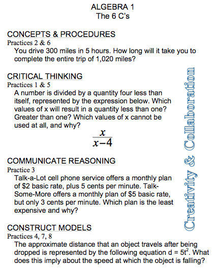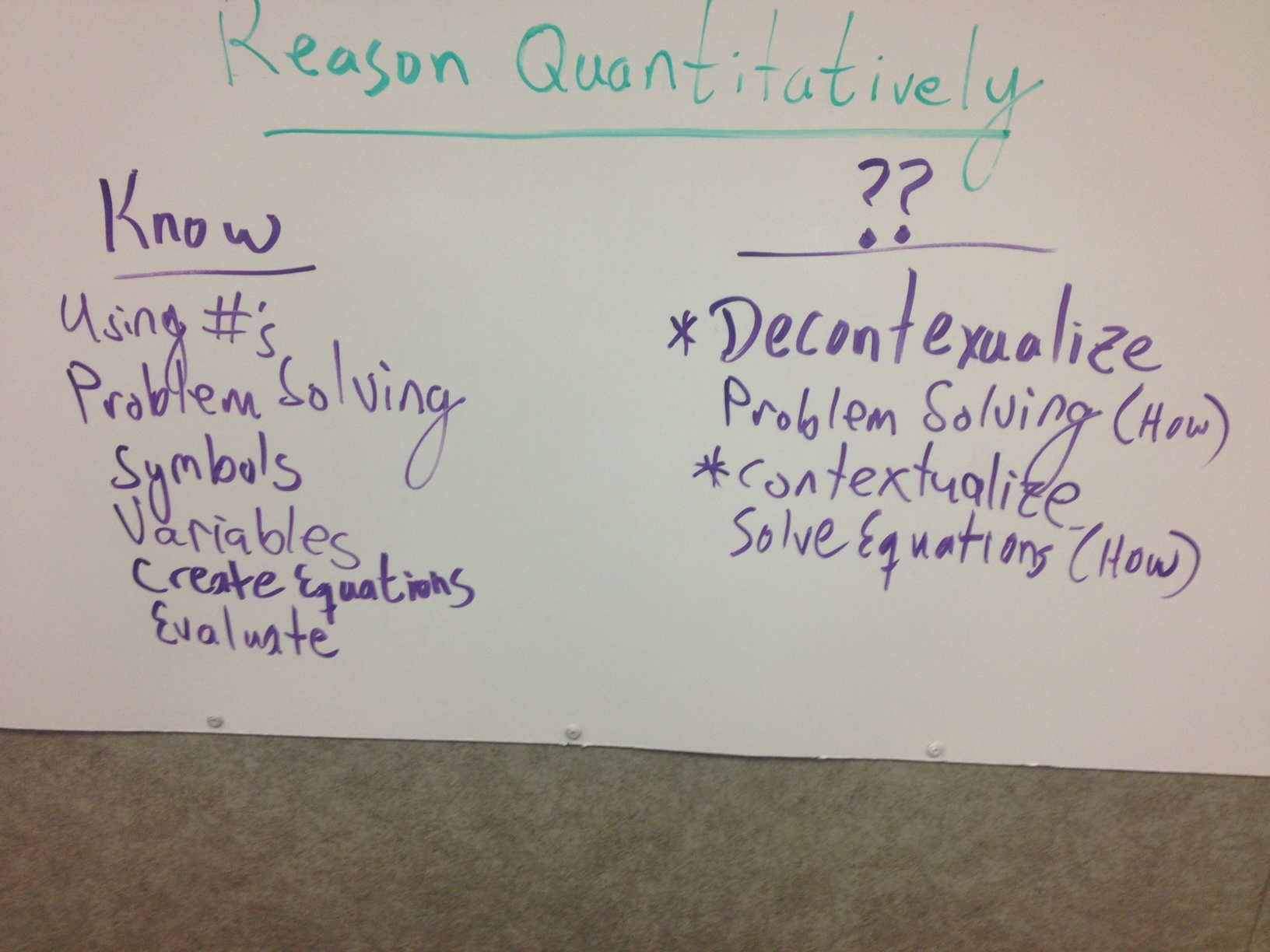 While I used the example at the right to describe the difference between contextualize and decontextualize, I let the students know that today we wouldn’t be doing that. Instead, we would being doing a lot of the things that they already know (using numbers, problem solving, evaluating). I found it very interesting that the class conceded to knowing what problem solving meant, but that they did not know how to do it.