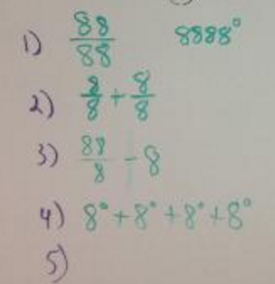 The 4-Digit Problem: I shared the rules of the 4-Digit problem, plus the 2 examples, and asked them to create the value 19 with four 8’s. They struggled which resulted in statements like “I feel stupid,” which I was trying to illicit so I could nix that thinking quickly. I shared that they would not have gotten this far if they were stupid. “I believe that you are all smart; I am paid to make you smartER.” I continued, Since they claimed to not know what problem solving looked like, I asked for problem solving strategies.” I just got blank stares. OK, everybody give something with four 8’s, I don’t care what the value. We threw a few up on the board, and discussed some that were close. I shared the hints given in the lesson plan, and let them go at it again. When I revealed the answer, I got a lot of “That’s cool.”