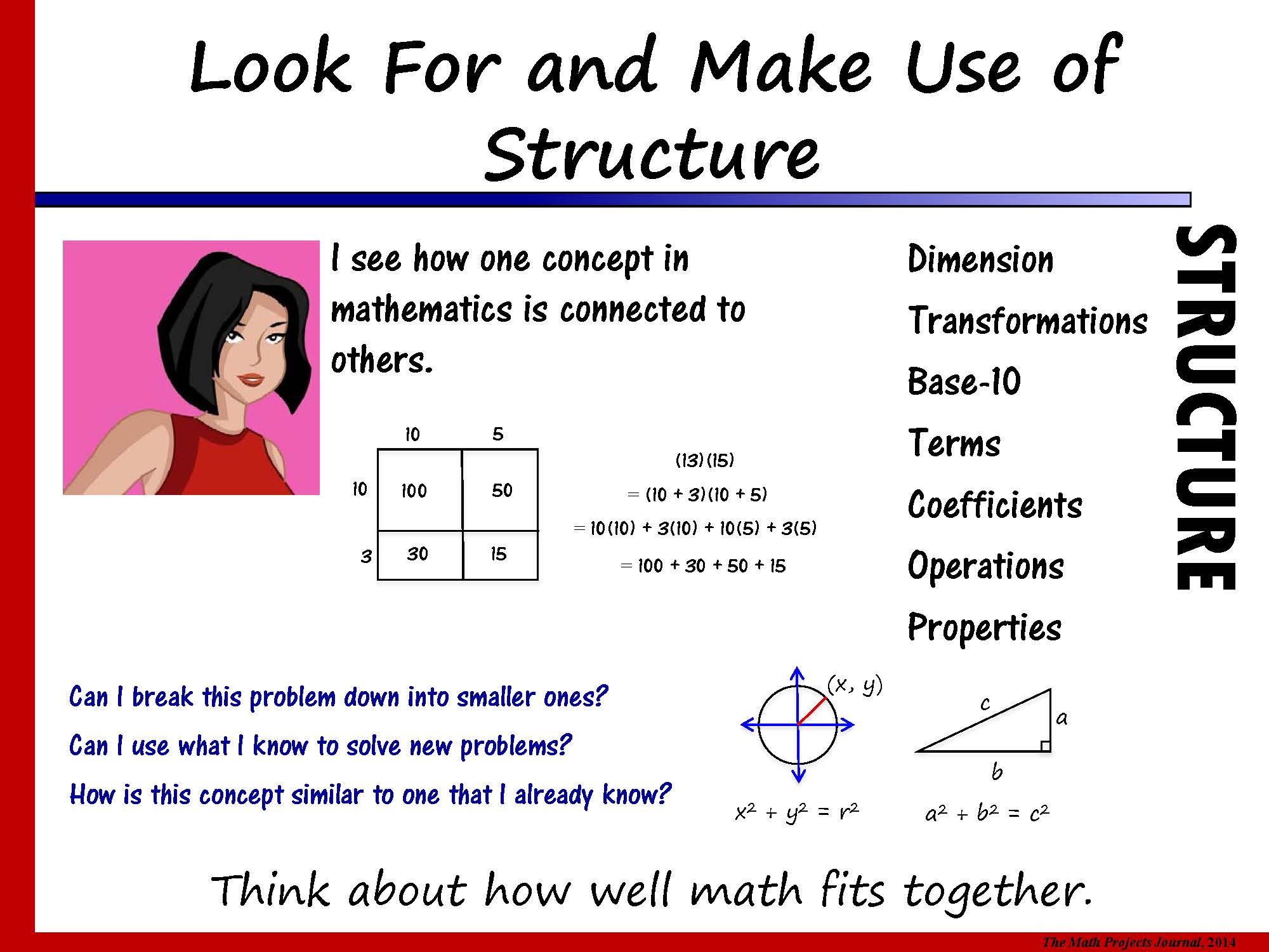 Try to identify the places in your lessons where you hope students are developing higher order thinking skills, and consider ways that you can be more deliberate and explicit in your pursuit of and assessment of these goals. For example, ask your students about any broader connections they are making from the mathematical content of the lesson. Give students opportunities to apply what they have learned in a lesson to other mathematical and non-mathematical topics. Let students know what you mean by phrases such as “critical thinking”, “problem-solving”, and “logical thinking”; give students examples of what these practices look like as well as tasks that allow them to develop and experience these important competencies.