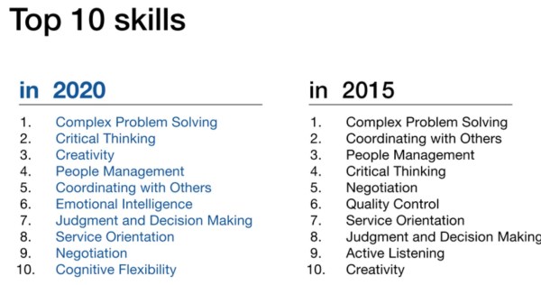 The final argument for using student groups for instruction is that collaboration itself is something that we should be teaching. The business community has been wanting the education system to graduate students who can more than just play nice together, but who can also work as a team to generate a quality product. This idea can be seen in the international survey conducted by the World Economic Forum, The 10 Skills You Will Need to Thrive in the Fourth Industrial Revolution. Employers were asked in 2015, what skills do they consider most valuable in an employee, and what they predict those skills will be 5 years later in 2020 (2 years ago as of this post). The Top 10 are shown below: