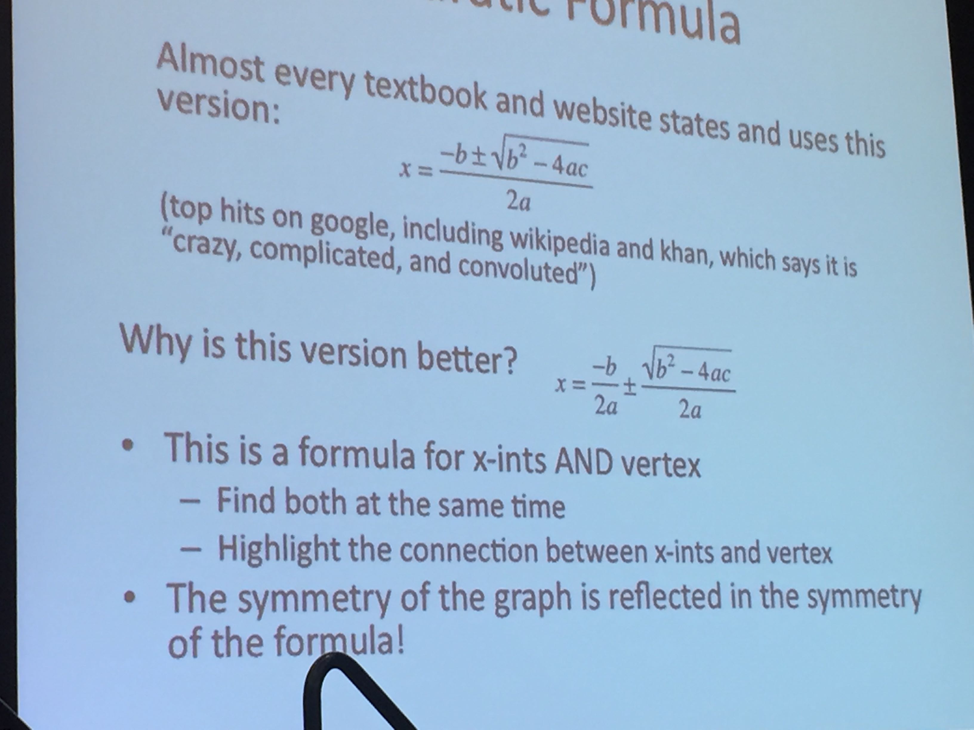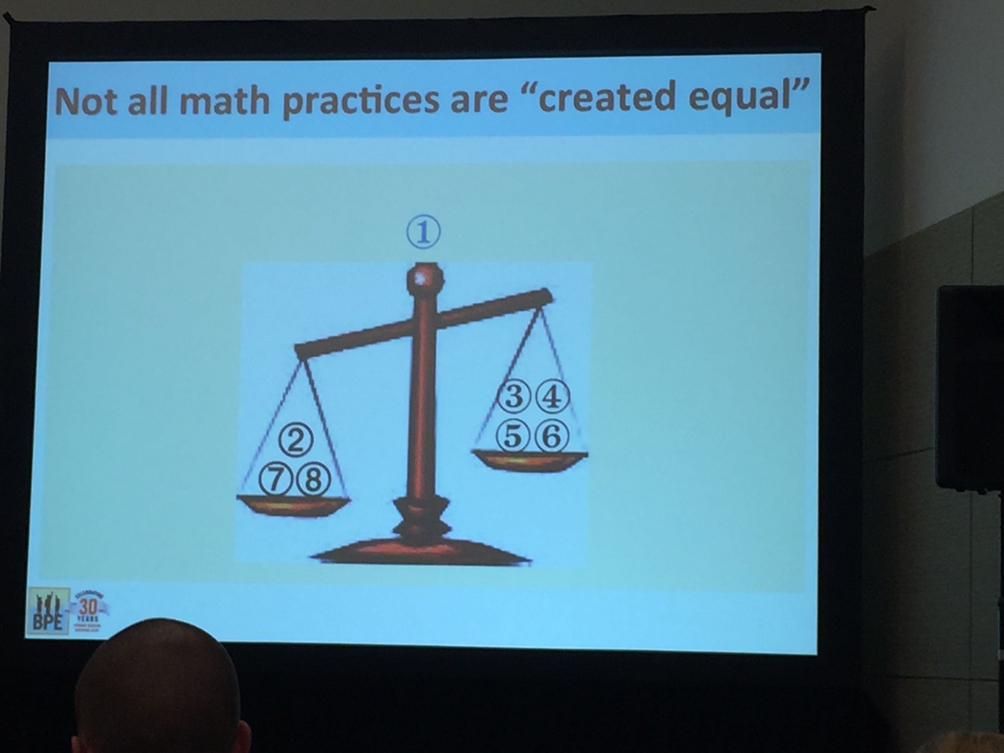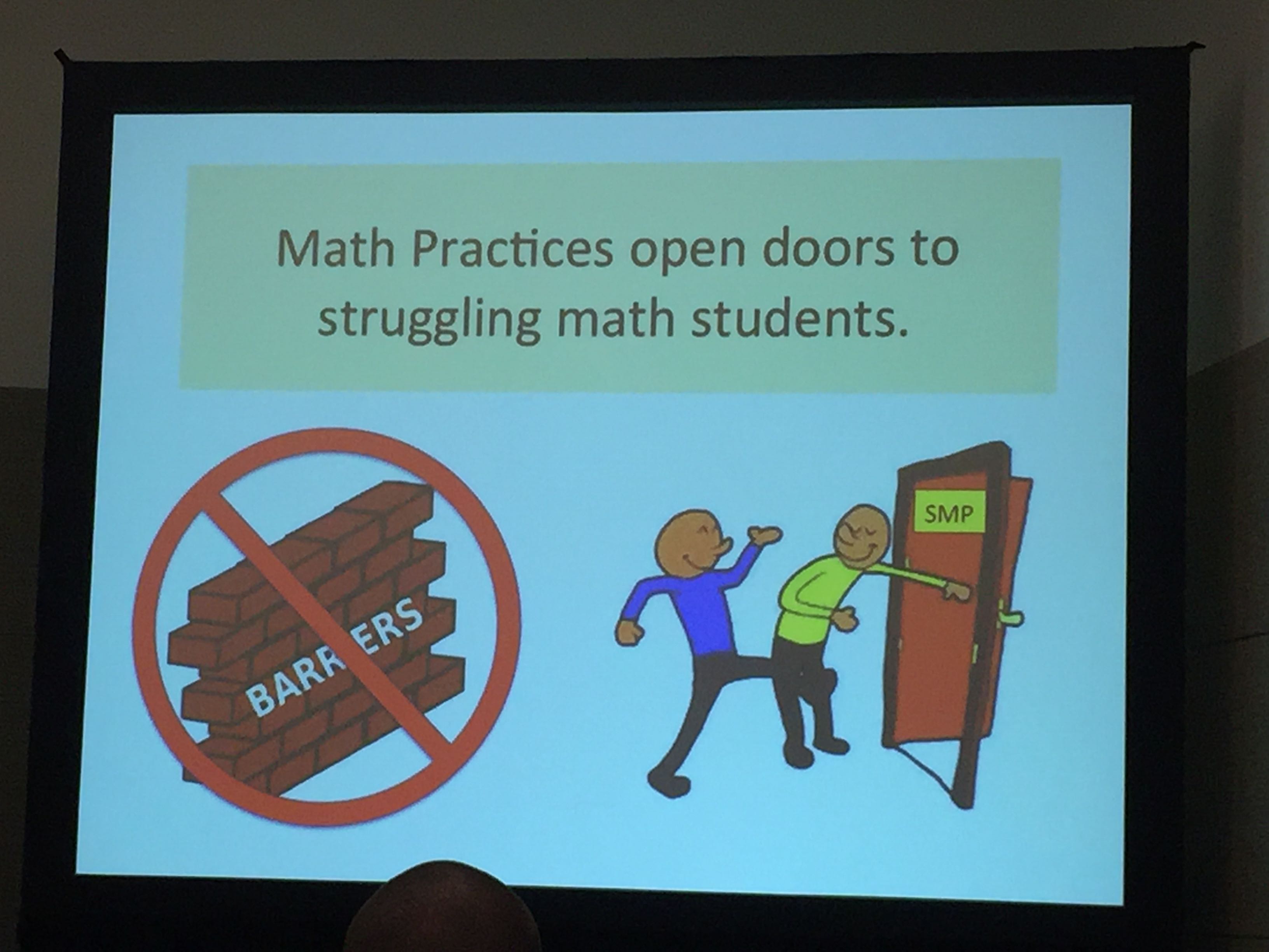 I arrived at Steve’s session expected a talk on ‘Gradual Release,’ because that is what was advertised in the program. I was intrigued, because this conventional instructional tool of ‘I do-We do-You do’ does not mesh with much of the problem-solving and discussion-rich tasks that Steve is known to promote. His title slide’s use of the word ‘reveal’ , however, exposed the misprint in the program. So I thought the presentation was going to be about the Gradual Reel-In of ‘You do-We do – I do’ method of leading class discussions on a math task. While Gradual Reveal is in the same spirit as the Gradual Reel-in it has a different purpose. It is a means to lead students to a critical question, rather than to specific concept or understanding.