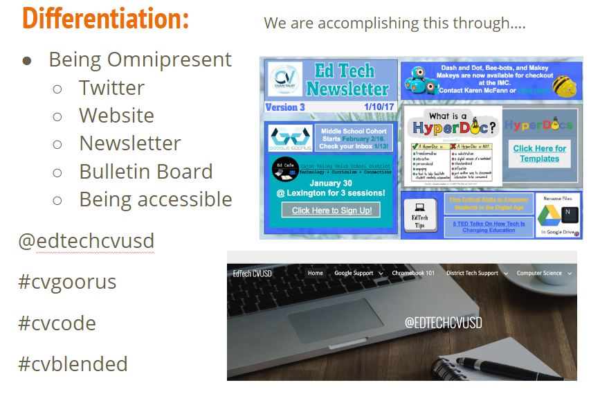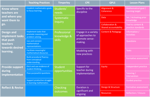 She then shared how she grouped them (which is what the color scheme was for). The idea was to take ALL the things that we want teachers to know and do and rather than create a checklist for them, cluster these concepts into Themes or Essential Elements and have teachers learn that.